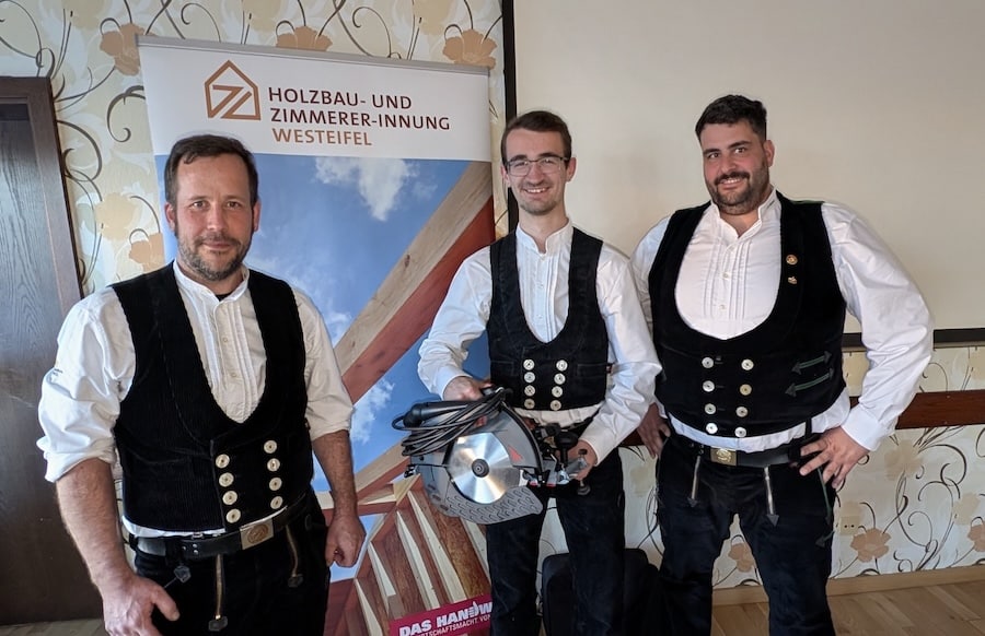 Der Prümer Mika Bormann hatte unter allen Prüflingen des Innungsbezirks das beste Ergebnis und konnte sich über einen hochwertigen Preis freuen. Überreicht wurde dieser von Obermeister Michael Fandel und von Markus Backes vom Gesellenprüfungsausschuss. Fachlichen Input gab es vom Fördermitglied Creaton/Wienerberger GmbH zum Thema Solarlösungen, bevor die Zimmerer beim gemeinsamen Abendessen ihr Netzwerk vertieften. (Quelle: Holzbau- und Zimmerer-Innung Westeifel)