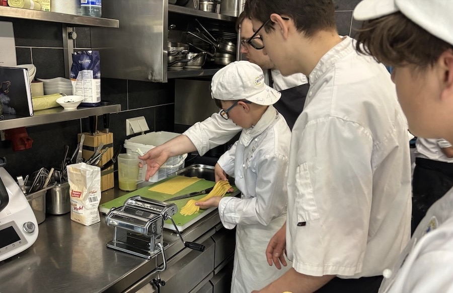 Natürlich wurde auch gemeinsam mit Alessandro Riemer und den beiden Auszubildenen Hüseyin Mowafi und Felix Koppelkamm gekocht. Auch dieses Mal gab es wieder etwas sehr Leckeres und Saisonales: selbstgemachte Nudeln mit Spargelsoße! Der Nudelteig wurde ordentlich geknetet, dann durch eine Nudelmaschine gedreht und zu Bandnudeln geschnitten.