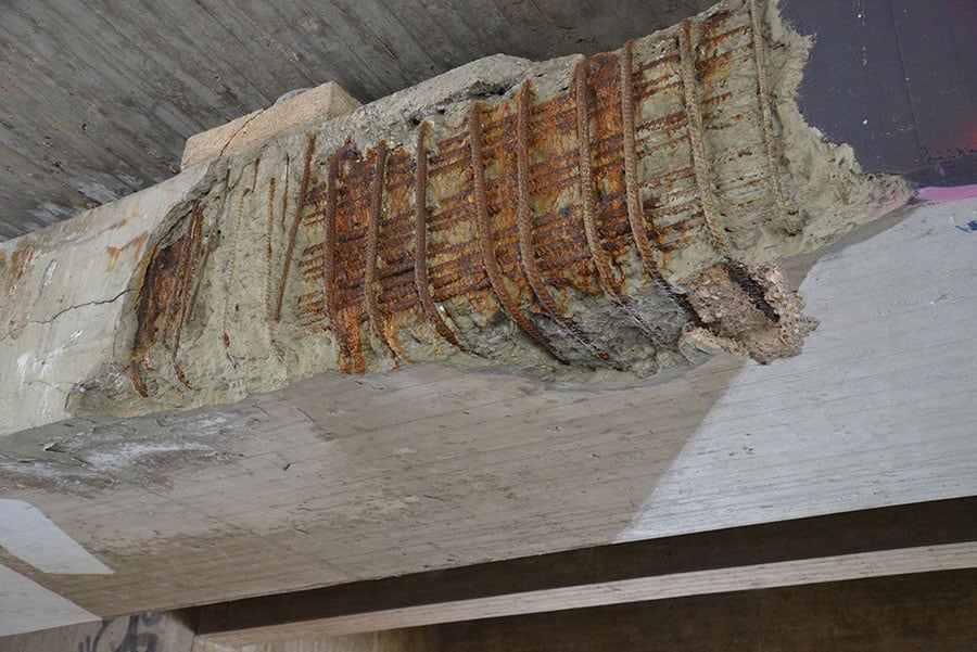 „Die Erschütterungen haben Beton absplittern lassen, teilweise liegen die Stahlbewehrungen frei. Eindringendes Wasser sorgt für Korrosion – das gefährdet die Stabilität.“