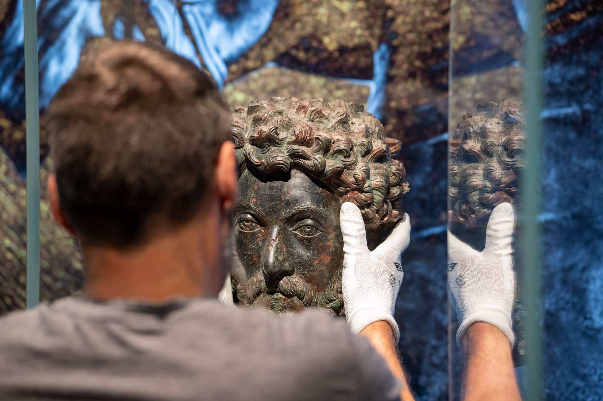 Ein bronzener Porträtkopf des Marc Aurels aus dem Janus Pannonius Museum im ungarischen Pécs wird im Rheinischen Landesmuseum Trier ausgepackt und in einer hohen Vitrine aufgestellt. Er stammt aus der Zeit 160 bis 170 nach Christus.