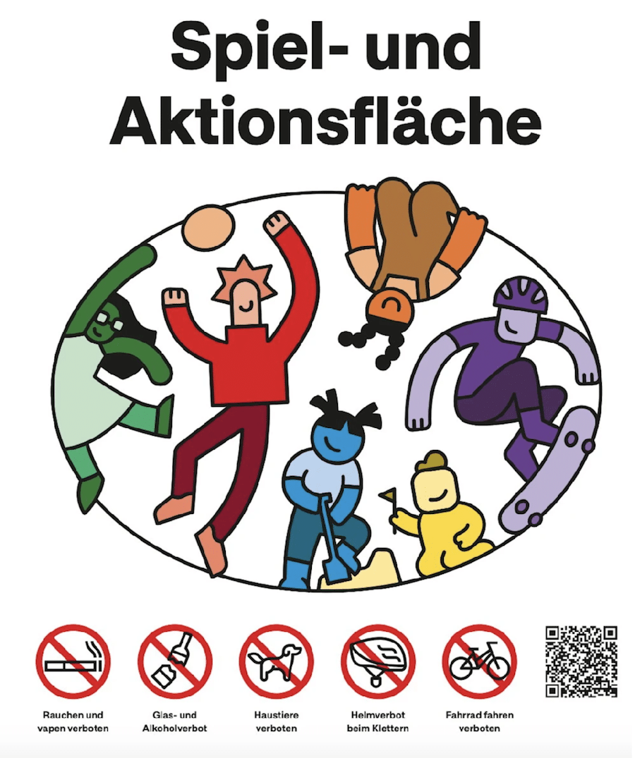 Ab Herbst 2025 sollen die neuen Schilder mit bunten Piktogrammen — Kinder im Sand, Ballspieler, Skater — an allen neuen und sanierten Flächen montiert werden.