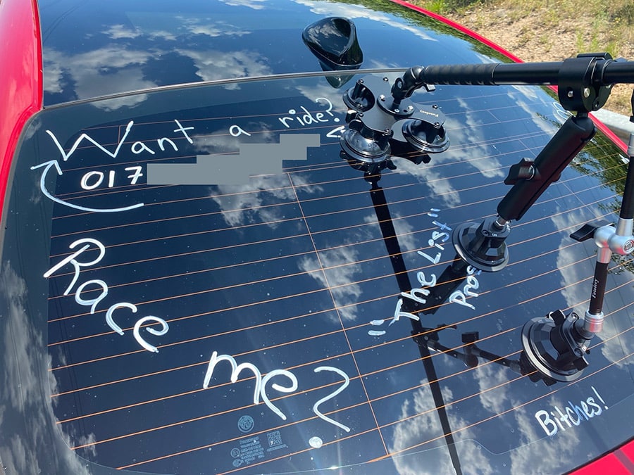 Auf allen Seiten des leistungsstarken Pkw war in englischer Sprache die Aufforderung zu einem Rennen angebracht. Ergänzt wurde dies durch die Telefonnummer des Fahrzeugführers sowie seinen Social-Media-Account, vermutlich um das Rennen mit einer anschließenden Veröffentlichung zu dokumentieren.