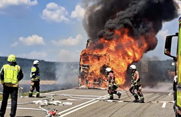 Aufgrund eines technischen Defektes musste der LKW-Fahrer sein Fahrzeug am Fahrbahnrand stoppen. Schon beim Aussteigen aus dem Fahrzeug schlugen Flammen aus dem Motorraum und griffen auf die komplette Zugmaschine und Auflieger über.