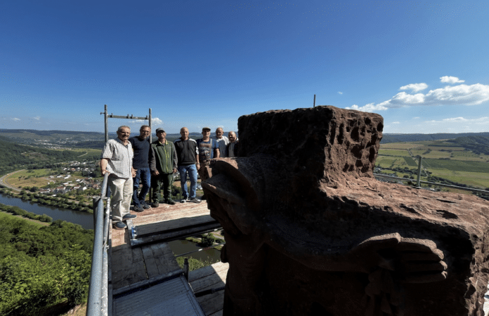 Für die Sanierung wurde das gesamte Kreuz zunächst aufwendig eingerüstet, um eine sichere Arbeitsumgebung zu gewährleisten. Im Anschluss reinigte das Team der Steinmetzwerkstatt Henning Wirtz aus Trier die Oberfläche des Sandsteins und entfernte Bewuchs sowie Schmutzablagerungen. Die vorhandenen Risse wurden fachgerecht versiegelt, alle Fugen erneuert und Stahlanker eingezogen, um den Querträger dauerhaft zu stabilisieren. Parallel dazu prüften Fachleute die Blitzschutzanlage und nahmen erforderliche Instandsetzungen vor.