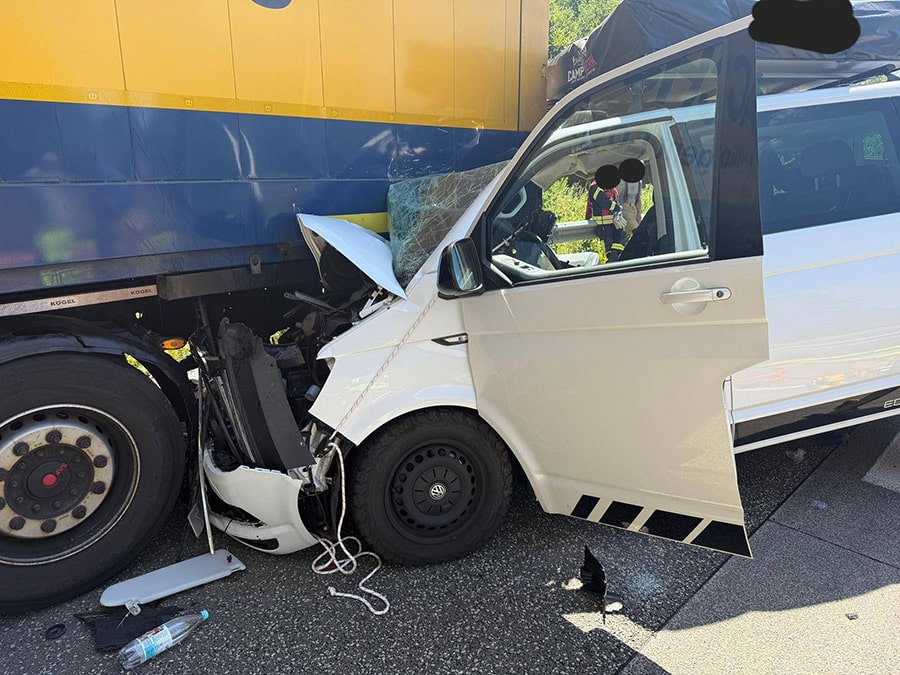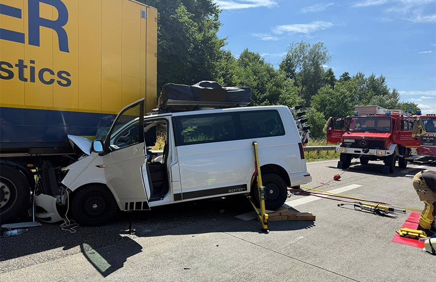 Das Unglück ereignete sich kurz vor 13 Uhr in Höhe der Anschlussstelle Bruchmühlbach-Miesau. Ein Lastkraftwagen hatte zuvor einen Reifenplatzer erlitten und stand als Pannenfahrzeug in der Autobahn-Ausfahrt. Ein nachfolgender VW-Multivan, der die Autobahn verlassen wollte, prallte aus noch ungeklärten Gründen vermutlich ungebremst auf den stehenden LKW-Anhänger. Beide Insassen des Multivans wurden bei dem Aufprall im Fahrzeug eingeklemmt und mussten von den Einsatzkräften befreit werden.