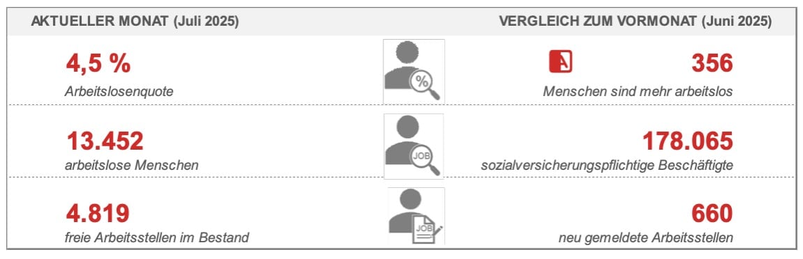 Die Arbeitslosigkeit ist im Bezirk der Agentur für Arbeit Trier (Stadt Trier, Landkreis Bernkastel-Wittlich, Eifelkreis Bitburg-Prüm, Landkreis Vulkaneifel, Landkreis Trier-Saarburg) im Juli 2025 gestiegen. 13.452 Menschen waren arbeitslos gemeldet, 356 Personen mehr (3 Prozent) als im Juni und 373 Personen bzw. 3 Prozent mehr als vor einem Jahr. Die Arbeitslosenquote betrug 4,5 Prozent und lag mit 0,1 Prozent über dem Vormonatsniveau. Vor einem Jahr lag sie bei 4,4 Prozent.