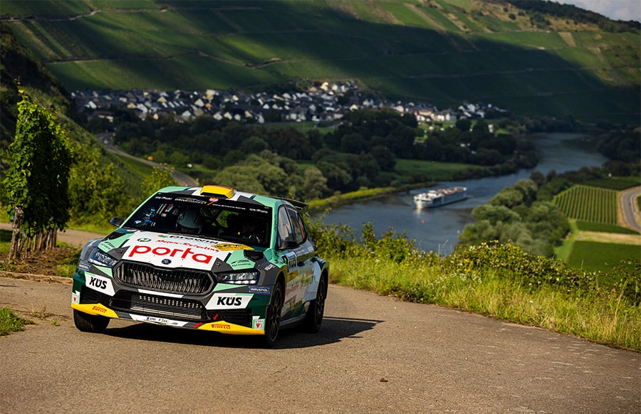 Der Hahnweiler übernahm gemeinsam mit Co-Pilotin Ella Kremer in der zweiten von 16 Wertungsprüfungen die Führung und gab sie bis zum Schluss nicht mehr ab. Konstant schnell und taktisch clever steuerte der aktuelle Deutsche Meister den Škoda Fabia RS Rally2 über die Weinberge und kontrollierte von der Spitze aus das Geschehen.