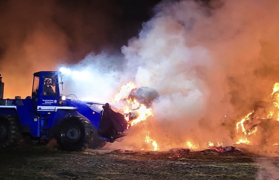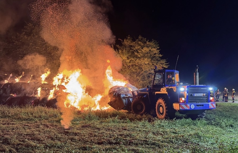 Die Rundballen wurden durch die Feuerwehr und das Technische Hilfswerk großflächig auseinandergezogen und punktuell abgelöscht. Aktuell wird das restliche Heu kontrolliert abbrennen gelassen.