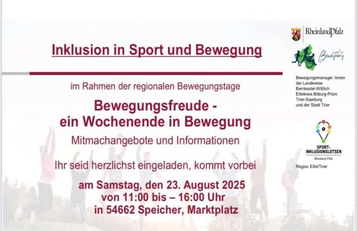 SPEICHER. Am Samstag, 23. August 2025, verwandelt sich der Speicherer Marktplatz in ein buntes Zentrum der Begegnung und Bewegung. Unter dem Motto „Inklusion in Sport und Bewegung“ lädt die Landesinitiative „Rheinland-Pfalz – Land in Bewegung“ gemeinsam mit zahlreichen Partnern zum großen Inklusionstag 2025 ein.