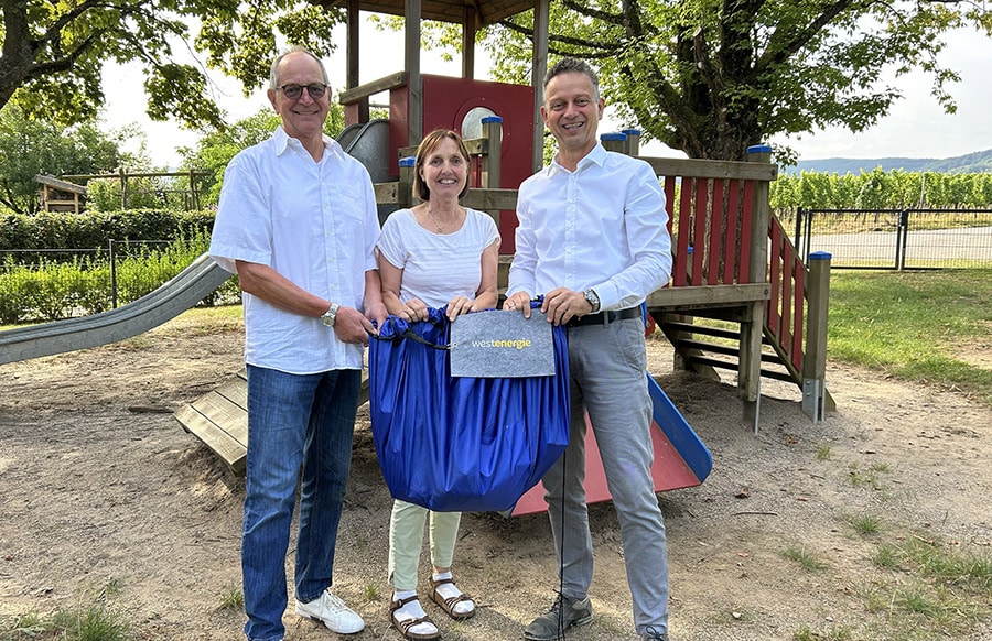 Bei der Übergabe waren der Erste Beigeordnete von Detzem Tobias Lorenz, Ortsbürgermeister von Köwerich Manfred Strauch sowie Westenergie-Regionalmanager Marco Felten vor Ort.