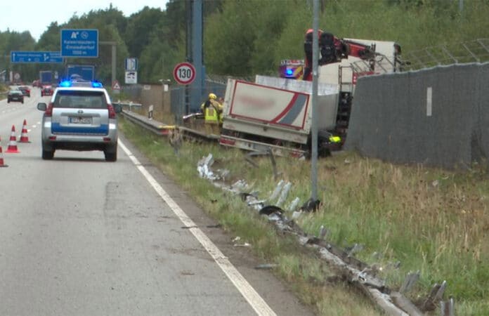 Nach den bisherigen Ermittlungen hatte der Fahrer wahrscheinlich aufgrund eines Reifenschadens die Kontrolle über sein Fahrzeug verloren, war dann zunächst gegen die Schutzplanke und schließlich gegen den Zaun geprallt. Der Lastwagen wurde erheblich beschädigt. Für die Räumungsarbeiten wurde der rechte Fahrstreifen gesperrt, die Dauer war zunächst unklar.