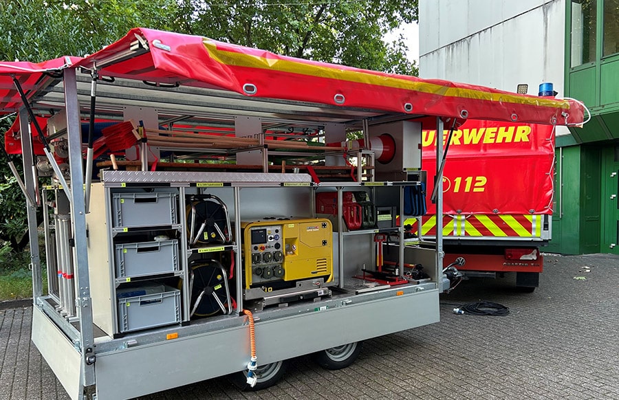 Diese sind mit allen Gerätschaften, die es für den schnellen Einsatz bei Starkregen und Hochwasser sowie Wald- und Vegetationsbränden braucht. Neben Schlauchmaterial und Strahlrohren sind u.a. Beleuchtungsmaterial und ein Stromaggregat an Bord. Weiterhin gibt es verschiedene Tauch- und Schmutzwasserpumpen sowie zahlreiches Absperrmaterial. Im Falle eines Einsatzes bieten sie damit den Vorteil, schnell, flexibel und zielgerichteter einsetzbar zu sein.
