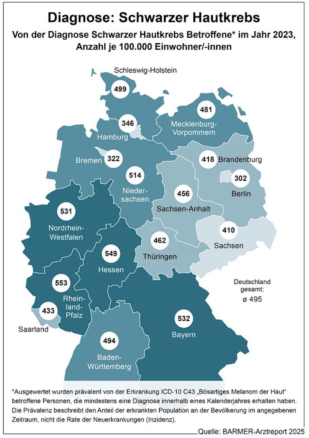 MAINZ. In keinem Bundesland sind mehr Menschen an schwarzen Hautkrebs erkrankt als in Rheinland-Pfalz. Das zeigt der Barmer-Arztreport. So kamen in dem Bundesland im Jahr 2023 auf 100.000 Einwohnerinnen und Einwohner 553 (Bund: 495) mit schwarzem Hautkrebs. Das entspricht nach Hochrechnungen der Krankenkasse 23.000 Personen.