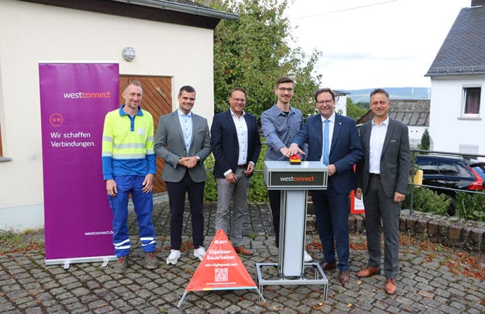 Zur feierlichen Inbetriebnahme trafen sich Landrat Andreas Hackethal, Ortsbürgermeister Jannick Jungbluth, regionale Vertreter der Westconnect, der Westenergie und der Westnetz sowie der Projektbeauftragte des Landkreises Bernkastel-Wittlich, Kevin Schwiderski, in Gielert. Gemeinsam setzten sie das Signal für die neue digitale Infrastruktur.