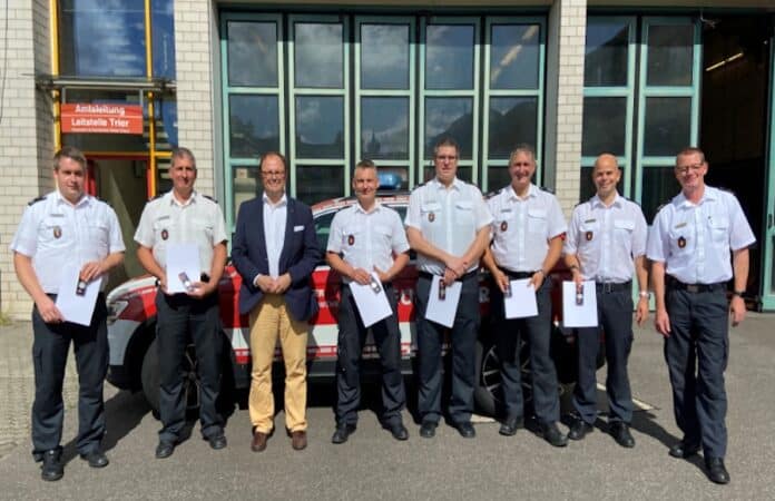 Feuerwehrdezernent Ralf Britten überreichte den acht Einsatzkräften Verdienstmedaillen des saarländischen Innenministeriums. „Ihr wart sofort vor Ort und habt unter schwierigsten Bedingungen Menschenleben gerettet. Dafür danken euch die Stadt Trier und das Saarland gleichermaßen“, betonte Britten.