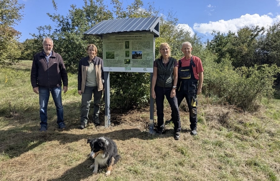 Die Fläche ist aufgrund ihrer vielen, seltenen Pflanzen- und Insektenarten für die Artenvielfalt von besonderer Bedeutung und wurde daher im letzten Jahr in Kooperation mit dem Deutschen Alpenverein, Sektion Trier, entbuscht. In Zukunft wird sie jährlich gemäht. Um die Öffentlichkeit für das wertvolle Biotop zu sensibilisieren, wurde jetzt von Erwin Baldauf, Hannelore Konz, Gudrun Zolitschka und Bernd Mutschler (v.l.) eine Infotafel aufgestellt. (Quelle: NABU Regionalstelle RLP-West)