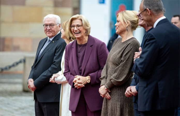 Fröhliche Stimmung zum Tag der Deutschen Einheit in Saarbrücken: Gastgeberin und Ministerpräsidentin Anke Rehlinger (SPD) (M) mit Bundespräsident Frank-Walter Steinmeier (l), seiner Frau Elke Büdenbender, Bundestagspräsidentin Julia Klöckner, ihrem Partner Jörg Pilawa und Bundeskanzler Friedrich Merz (CDU). Foto: Pinter Laszlo/dpa