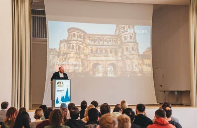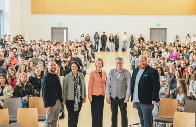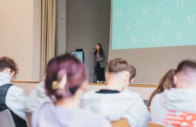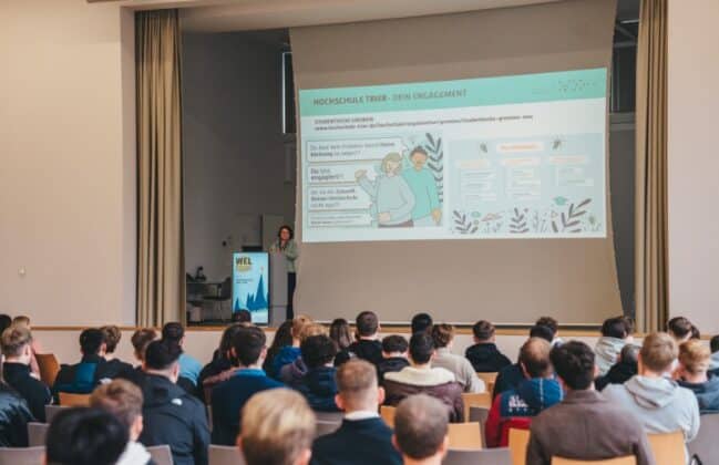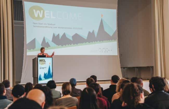 In der voll besetzten Aula am Schneidershof hieß die Hochschulleitung gemeinsam mit Vertreter*innen der Stadt Trier und des Studierendenwerks die neuen Studierenden herzlich willkommen. Präsidentin Prof. Dr. Dorit Schumann, Vizepräsidentin Prof. Dr.-Ing. Beate Massa, der Vorstand des ASta, Kulturdezernent Markus Nöhl sowie Andreas Wagner, Geschäftsführer des Studierendenwerks Trier, betonten in ihren Grußworten die Bedeutung des Studienbeginns und die große Freude über die Wahl der Studierenden für die Hochschule Trier.