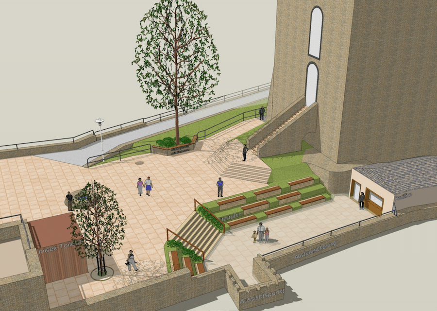 Der bestehende barrierearme Weg zum Aufzug wird in das neue Konzept integriert, sodass die gesamte Anlage künftig für alle Besucher komfortabel zugänglich bleibt.