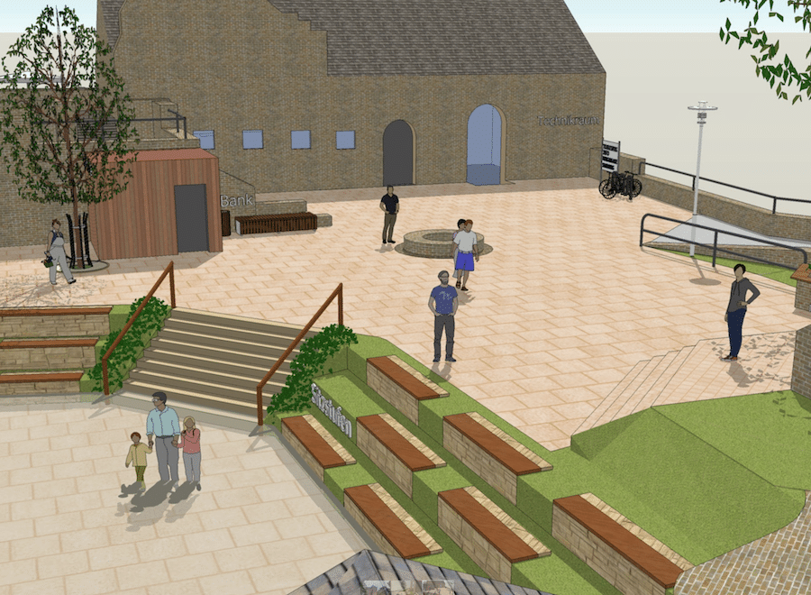 Im Mittelpunkt der Bauarbeiten steht die Vereinigung des bisher zweigeteilten Bereichs zu einer großzügigen Aufenthaltsfläche.