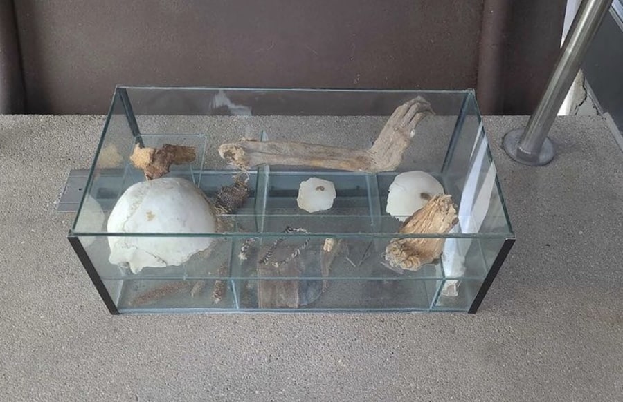 Die Vitrine war in der Nacht vom 3. auf den 4. Oktober in der Domstadt vor der Generaldirektion Kulturelles Erbe Rheinland-Pfalz hinterlassen worden. Die Knochen, Kleidungsreste und Weiteres könnten Experten zufolge mindestens 1.000 Jahre alt sein, hieß es. (Quelle: dpa)