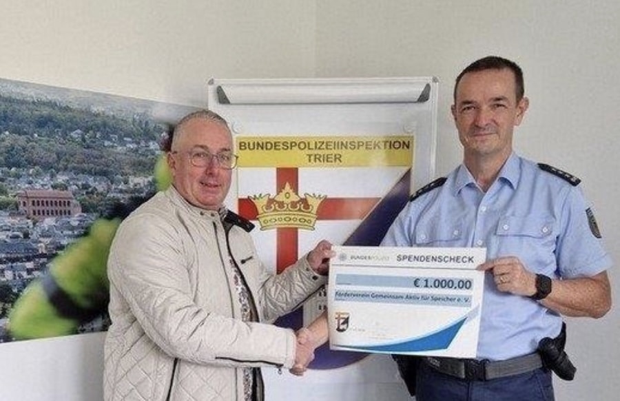 Der diesjährige Spendenertrag von 1.000 Euro ging an den „Förderverein Gemeinsam Aktiv für Speicher e. V.“ Der 1. Vorsitzende Jürgen Rauschenbach, zugleich Mitglied bei den Sportschützen Speicher e. V., nahm die Spende entgegen. Er bedankte sich im Namen des Fördervereins für die großzügige Spende, welche in die nächste, schon geplante Anschaffung einfließt. Der Verein hat sich u. a. zum Ziel gesetzt, die Gemeinschaft und den sozialen Zusammenhalt in Speicher zu fördern, kulturelle Aktivitäten zu unterstützen und die Infrastruktur/Lebensqualität zu verbessern. (Quelle: Bundespolizeiinspektion Trier)