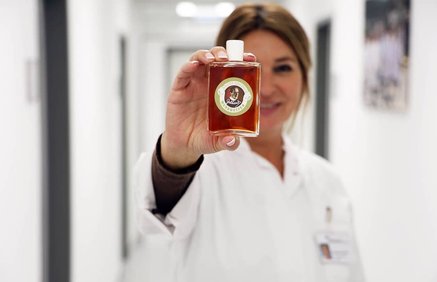 Auch Diana Deutsch, Zusatzkraft in der Werkstatt für Menschen mit Behinderung, muss niemand mehr überzeugen: „Wenn ich als Kind Bauchweh hatte, gab mir meine Oma ein paar Tropfen Mundwasser auf einem Stück Zucker“, schwelgt sie kurz in Erinnerungen und ergänzt dann schmunzelnd: „Und es hat tatsächlich geholfen.“ Behaupten, dass das Mundwasser nachweislich gesundheitsfördernde Wirkung hat oder gar als Arznei taugt, dürfen und wollen Diana Deutsch und Daniel Olk nicht. Dafür bräuchte es groß angelegte und entsprechend teure Studien, was bei einem Nischenprodukt mit überschaubarem Absatz – denn als Massenware taugt das Mundwasser wahrlich nicht – schwierig und nur bedingt sinnig wäre.