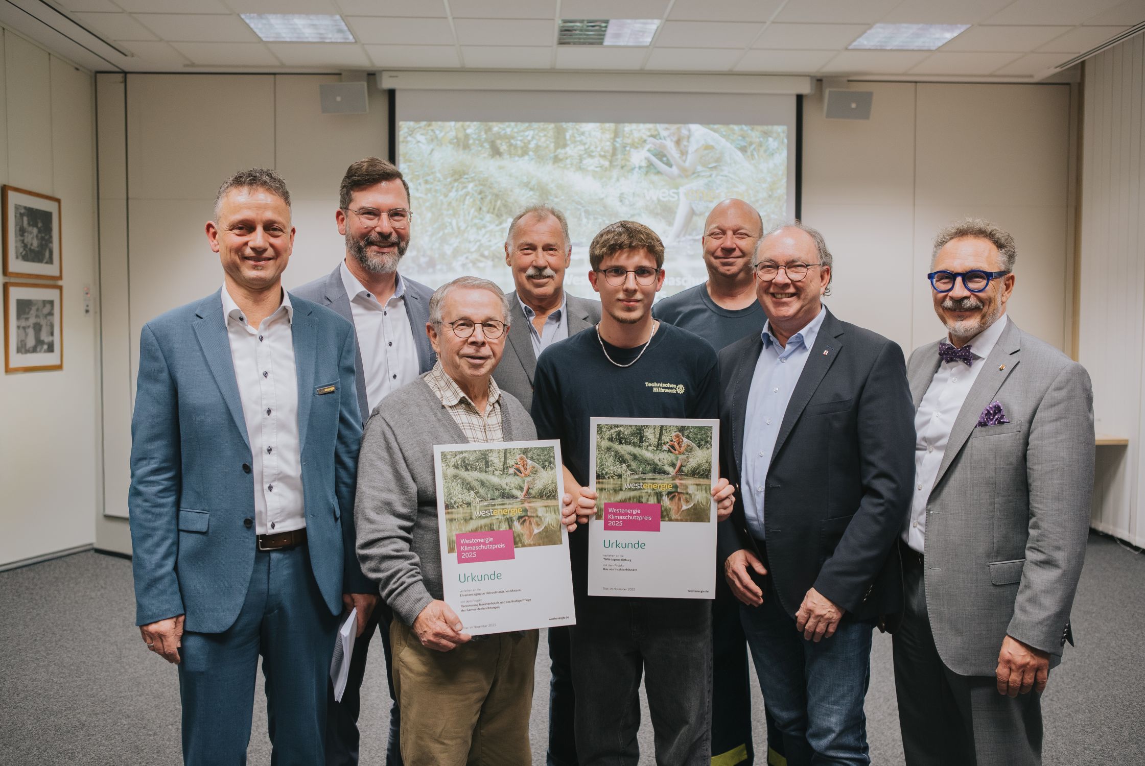 Übergeben wurden die Preise von Michael Ludwig, erster Kreisbeigeordneter des Eifelkreises Bitburg-Prüm, Janine Fischer Bürgermeisterin der Verbandsgemeinde Bitburger Land, Stefan Krein, erster Beigeordneter der Verbandsgemeinde Speicher, Horst Zwank, Beigeordneter der Verbandsgemeinde Südeifel, sowie Westenergie-Regionalmanager Marco Felten und Westenergie-Kommunalmanager Christian Nathem.