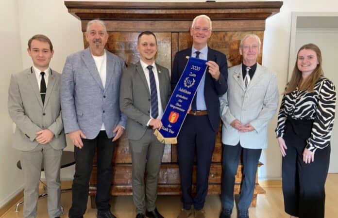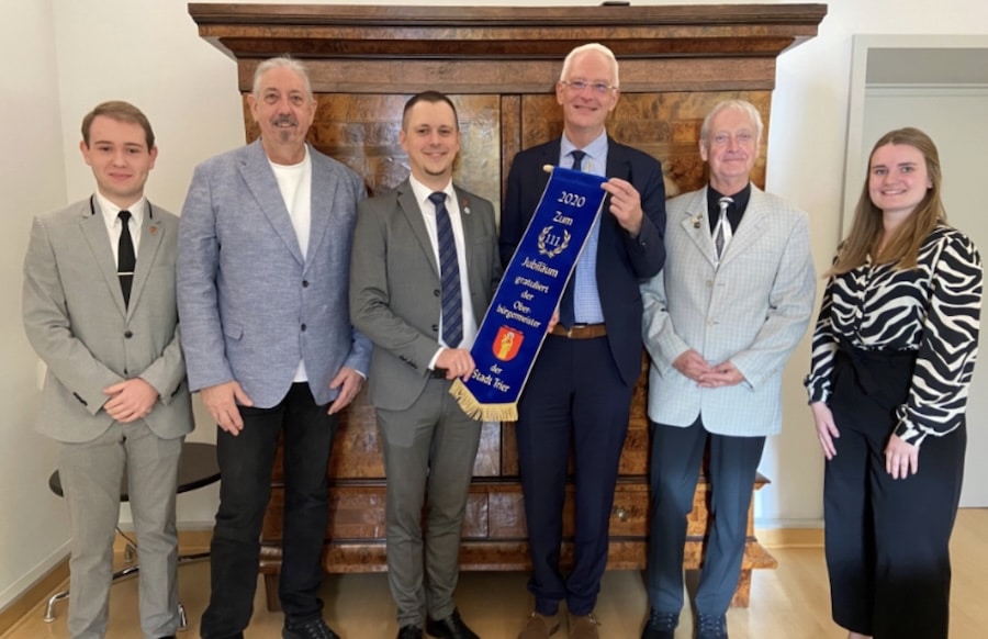 TRIER. Oberbürgermeister Wolfram Leibe empfing Vorstandsmitglieder des Theater- und Karnevalsvereins „Blau-Weiß Ehrang 1909“ im Rathaus und übergab anlässlich des 111. Jubiläums des Vereins ein Fahnenband an den Vereinsvorsitzenden Dennis Labarbe. Der 580 Mitglieder zählende Verein feierte bereits 2020 sein Jubiläum.