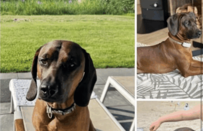 Der Hund ist auf den Fotos als brauner, schlanker Hund mit dunklem Kopf und kurzem Fell erkennbar.