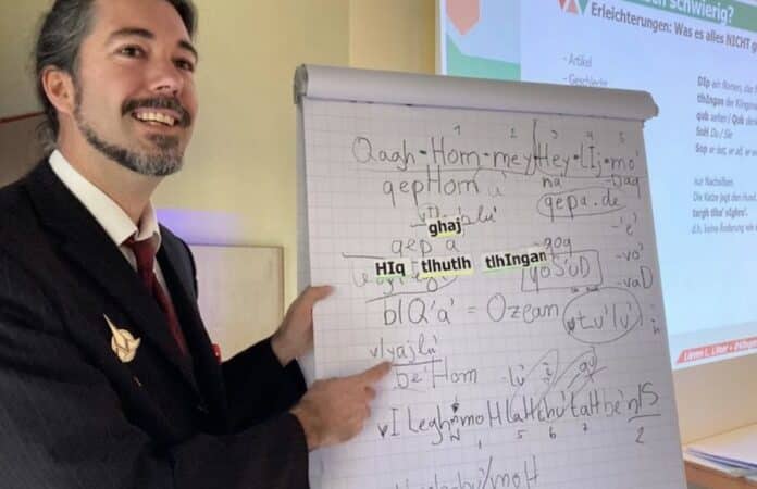 Der Lehrer schätzt, dass weltweit gut 50 Menschen fließend Klingonisch sprechen – eine Sprache mit vielen Zungenbrechern und Kehlkopflauten. Zudem gebe es Tausende Schüler. (Quelle: dpa)