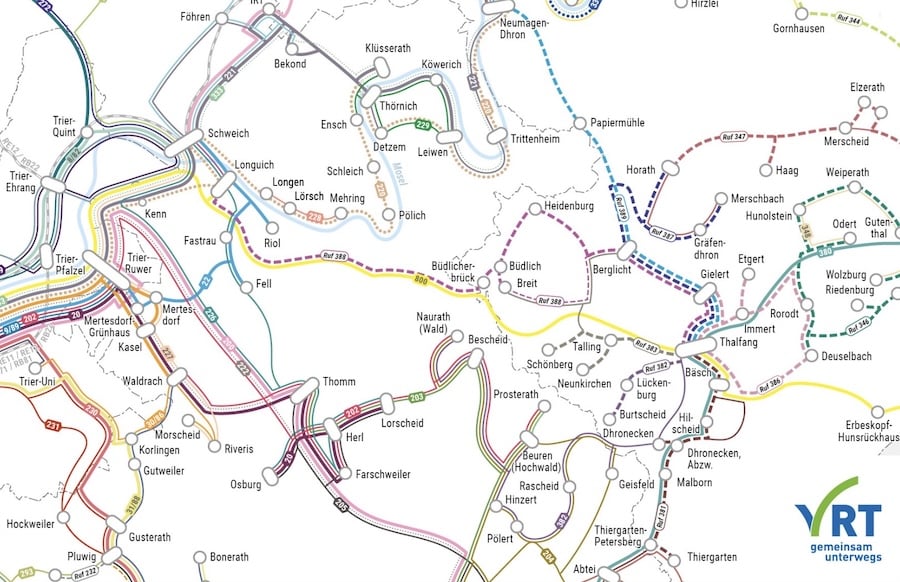 Im Detail ändert sich hier beispielsweise Folgendes: Wer aus Talling oder Schönberg nach Trier zur Schule geht, steigt ab dem Fahrplanwechsel am 14. Dezember 2025 in Thalfang um – von der Linie 383 auf die Linie 800. Wer aus diesen Orten nach Schweich zur Schule geht steigt in Breit von der 383 auf die 388.