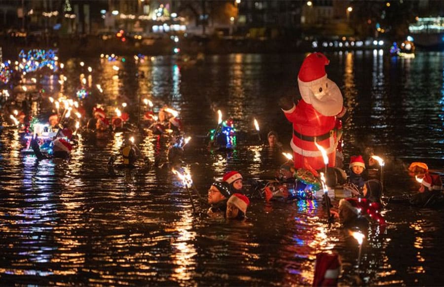 Für das besondere Ereignis legten die rund 100 Schwimmer eine rund 1,8 Kilometer Strecke zurück. Sie alle hielten Fackeln in ihren Händen und trugen rote Nikolausmützen und spezielle Tauchanzüge. Viele Zuschauer säumten das Ufer und die Brücke, um das Lichtspektakel zu bestaunen.