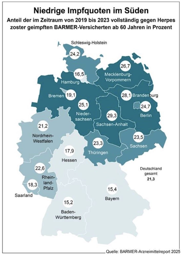 SAARBRÜCKEN. Im Saarland sind deutlich zu wenig ältere Menschen gegen die gefährliche Gürtelrose geimpft. Das zeigt der Barmer-Arzneimittelreport. Demnach verfügten im Jahr 2023 nur 18,3 Prozent der saarländischen Barmer-Versicherten über 60 Jahren über eine vollständige Impfung gegen diese Krankheit, obwohl für Menschen dieses Alters eine entsprechende Impfempfehlung vorliegt und die Impfkosten von der gesetzlichen Krankenversicherung übernommen werden.