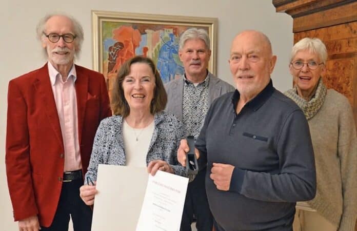 Winfried Wagner erhält die Ehrennadel mit Urkunde aus den Händen von Bürgermeisterin Elvira Garbes. Mit dem Geehrten freuen sich seine Frau Ingrid Thomé sowie seine Vereinskameraden Herbert Wüsten und Rainer Düro (hinten, v. r.). Foto: Stadt Trier