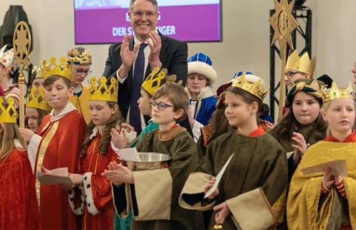 MAINZ – Sternsingerinnen und Sternsinger haben der rheinland-pfälzischen Staatskanzlei den Segensspruch «Christus mansionem benedicat» – Christus segne dieses Haus – überbracht.