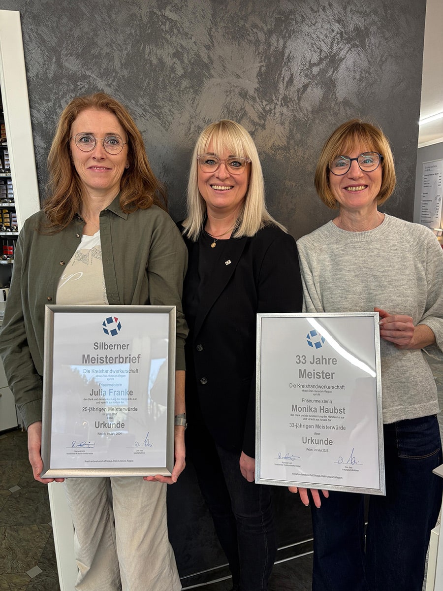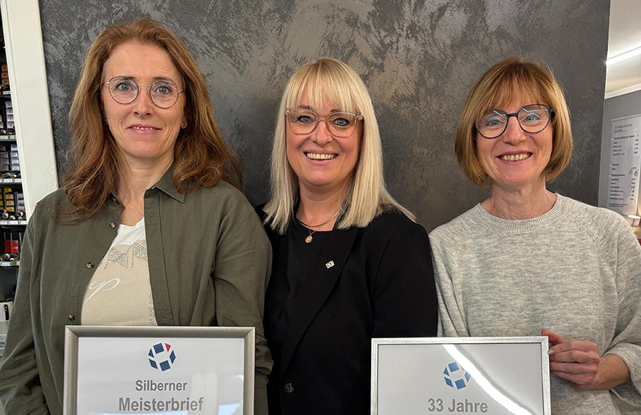 Julia Franke (links) erhielt die Silberne Meisterbrief Urkunde für 25 Jahre Meisterwürde. Monika Haubts eine Urkunde für 33 Jahre. „Wir sind stolz auf unsere Meister im Handwerk“, sagt die Obermeisterin, „und das ist uns eine Auszeichnung wert.“