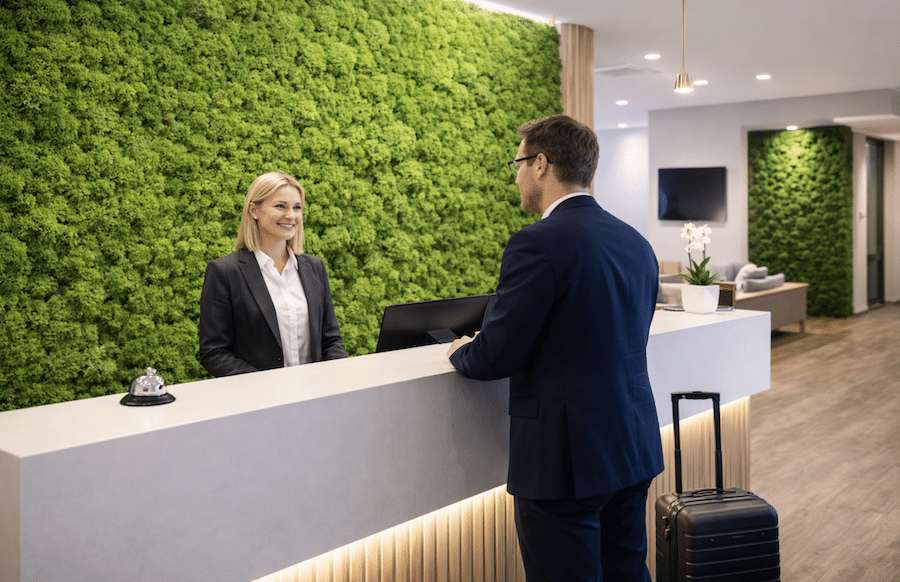 Kunst-Mooswände sind in Empfangsbereichen ein echter Blickfang. Ob in einem Hotel, einem Büro oder einer Praxis – die grüne Fläche zieht sofort Aufmerksamkeit auf sich und vermittelt einen modernen, natürlichen Eindruck. Besonders in Eingangsbereichen, in denen echte Pflanzen kaum überleben würden oder schwer zu pflegen sind, bieten Mooswände eine pflegeleichte und stilvolle Alternative. Sie brauchen kein Licht, kein Wasser und behalten dennoch ihr frisches Aussehen über viele Jahre hinweg.