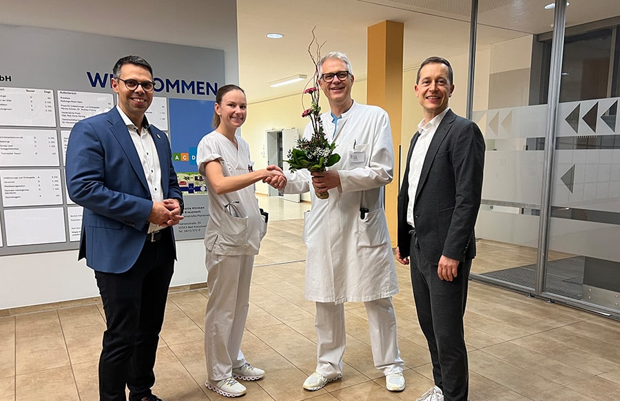 Die Klinikleitung ließ es sich nicht nehmen, persönlich zu gratulieren. Vorstand Andreas Heinrich, Geschäftsführer Manuel Seidel und der neue Chefarzt der Inneren Medizin, Dr. Daniel Schmitz, überreichten der Weltmeisterin einen Blumenstrauß und würdigten die außergewöhnliche Leistung. „Wir sind unglaublich stolz, eine so engagierte und disziplinierte Ärztin in unserem Haus zu haben. Frau Krug zeigt eindrucksvoll, dass Spitzenleistung im Beruf und im Sport möglich ist – mit Leidenschaft, Struktur und Teamgeist. Im Namen der gesamten Klinik gratulieren wir herzlich zu diesem Weltmeistertitel“, sagt Geschäftsführer Manuel Seidel.
