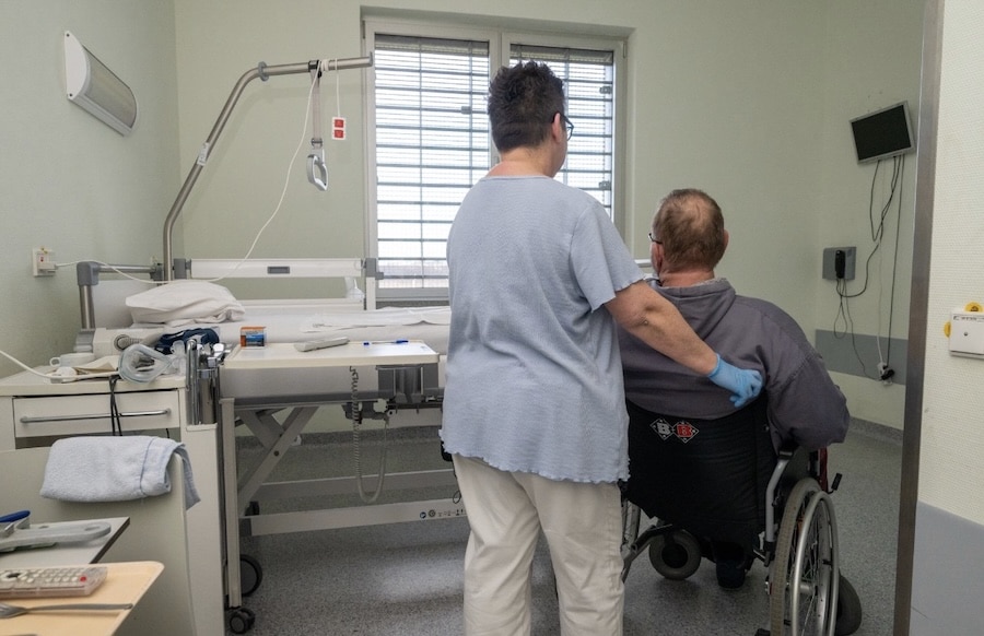 Im Krankenhaus auf dem Gefängnisgelände in Wittlich gibt es zudem noch vier weitere Pflege-Hafträume, die für Menschen mit hohen Pflegestufen sind. Sie sind zurzeit alle belegt, sagt die stellvertretende Pflegedienstleiterin Heidrun Schneider. Unter den Insassen ist ein 53-Jähriger, der nach mehreren Schlaganfällen auf Hilfe angewiesen ist. Er sitzt im Rollstuhl.