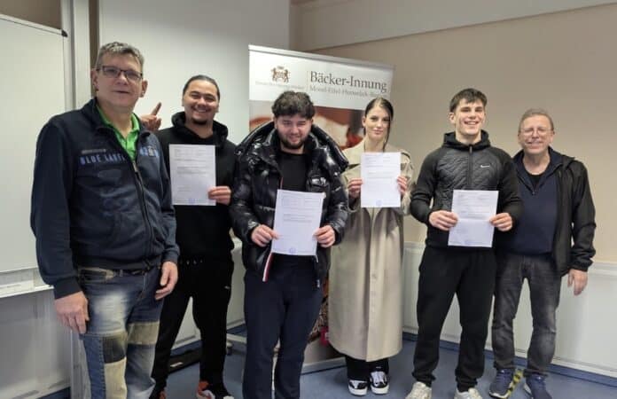 Die Prüfung legten Sie vor dem Gesellenprüfungsausschuss der Bäcker-Innung Mosel-Eifel-Hunsrück Region ab. Der Vorsitzende des Ausschusses, Karsten Fleury (links) und sein Prüfungskollege Stefan Jänschke (rechts) beglückwünschten die Bäcker Lukas Rummel, Nuhat Alas und Jasmin Steinen (nicht im Bild) sowie die Fachverkäufer Antonia Solijanikow und Hassan Adzieva bei der Übergabe der Prüfungsbescheinigungen im Haus des