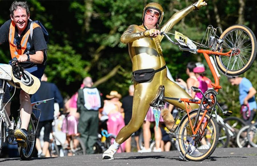 Der Kalmit-Klapprad-Cup gilt vielen als das absurdeste Bergrennen Deutschlands Foto: Uwe Anspach/dpa
