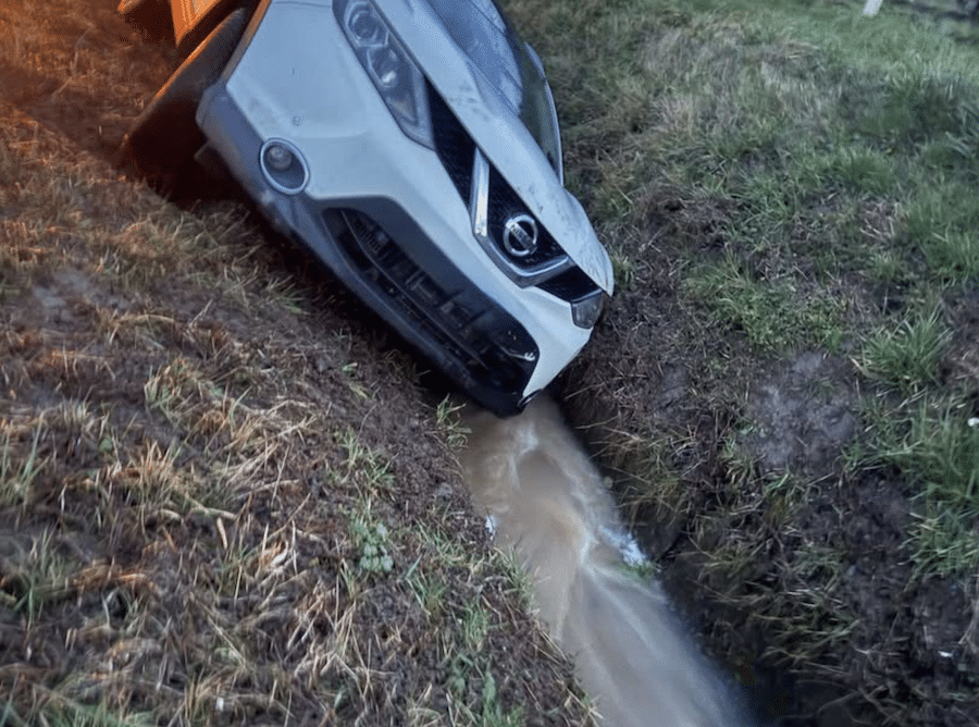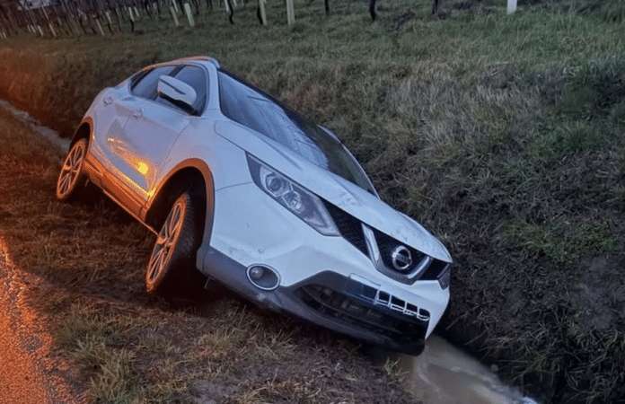 Am vergangenen Freitag, 13. Februar 2026, gegen 6.40 Uhr verliert der Fahrer in der Morgendämmerung die Kontrolle über sein Auto. Die Straßen sind feucht, die Temperaturen niedrig. Der Wagen rutscht von der Fahrbahn, landet im Straßengraben und bleibt schräg stehen. Wasser läuft am Fahrzeug entlang. Der Fahrer kann sich nicht selbst befreien.