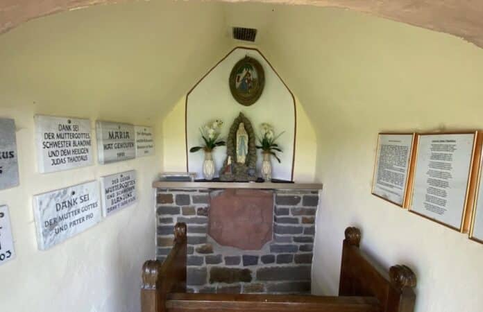 „Das ‚Backes‘-Kapellchen steht am früheren Weg nach Odert unter einer 300 Jahre alten, zerzausten Eiche. Der richtige Name ist ‚Maria Ruh‘. Es wurde 1855-57 von der Familie Stein (Hausname: Backes) erbaut. Damit löste die Familie ein Versprechen ein, da ihre Gebete erhört wurden und eines ihrer zwei Mädchen von einer schweren Krankheit geheilt wurde. Im Inneren steht auf einem gemauerten Sockel eine Nachbildung der Grotte von Lourdes, in der eine Statue der Gottesmutter steht. In die Vorderwand des Sockels ist ein Sandstein eingefügt, der ein Relief der Flucht nach Ägypten zeigt.