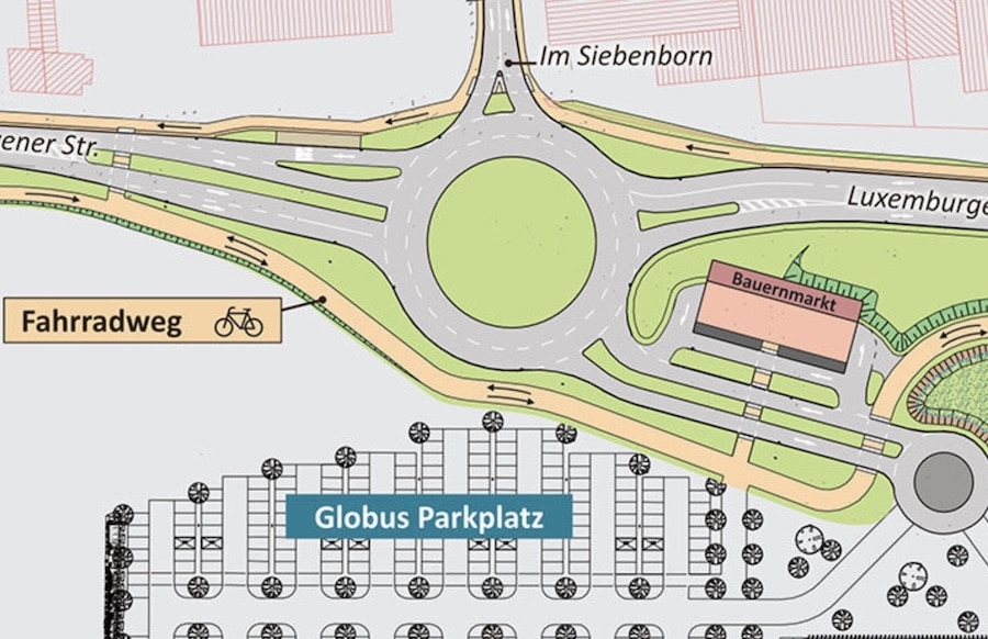Der aktuelle Planungsstand für die Anbindung des Marktes an das öffentliche Straßen- und Verkehrsnetz wurde nun durch Vertreter der Globus-Gruppe im Dezernatsausschuss IV vorgestellt. Für diese Anbindung ist zum einen der Umbau der Zewener Straße, inklusive der bisherigen Busspuren, und zum anderen die Angleichung der Straße „Im Siebenborn“ erforderlich. Zur Anbindung an das Straßennetz sind zwei Kreisverkehrsanlagen geplant: ein großer Kreisverkehr mit einem Durchmesser von 60 Metern und einer Fahrbahnfläche von zehn Metern sowie ein kleinerer, überfahrbarer Kreisverkehr mit 24 Metern Durchmesser.