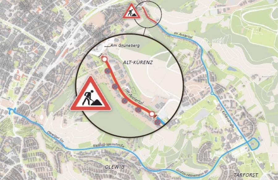 Die Umleitung für den Verkehr zwischen Tarforst und Alt-Kürenz verläuft weiträumig über die Kohlen-, Gustav-Heinemann-, Riesling-Wein- und Olewiger Straße. Die Zufahrt zum Grüneberg bleibt geöffnet. Die Stellplätze am Straßenrand des gesperrten Abschnitts können während der Bauarbeiten nicht genutzt werden. Anwohner werden gebeten, ihre Fahrzeuge rechtzeitig außerhalb des Baufeldes abzustellen. Die Zufahrt zu Privatparkplätzen auf den angrenzenden Grundstücken ist nur außerhalb der Arbeitszeit und auf eigene Gefahr möglich. Der entlang der Fahrbahn verlaufende Gehweg ist nicht betroffen und kann während der gesamten Bauzeit uneingeschränkt genutzt werden.