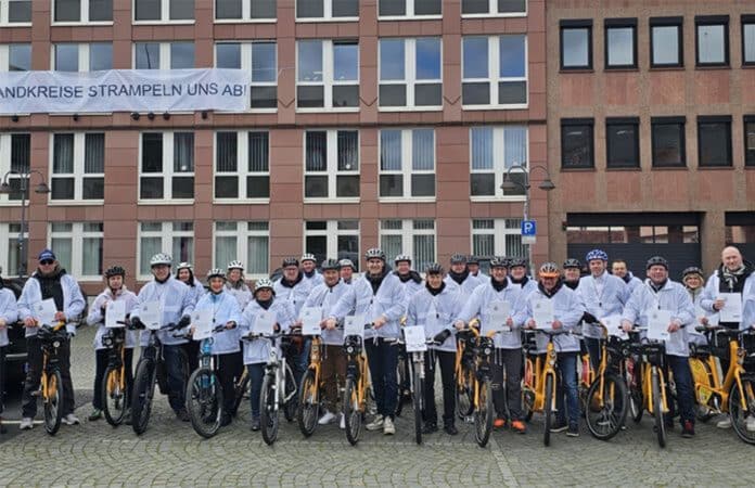 MAINZ – Die rheinland-pfälzischen Kommunen schlagen Alarm und nehmen die künftige Landesregierung in die Pflicht. Unter dem Motto «Wir Landkreise strampeln uns ab!» starteten alle 24 Landrätinnen und Landräte im Land eine gemeinsame Fahrradaktion durch die Landeshauptstadt Mainz.