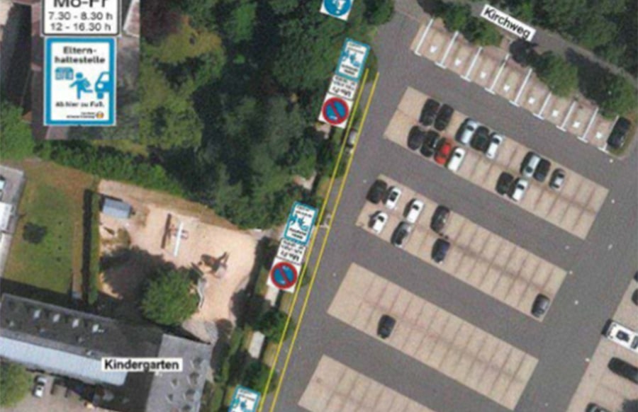 Die Beschilderung der neuen Elternhaltestelle erfolgt nach den Empfehlungen des ADAC und wird zusätzlich durch Fahrbahnmarkierungen deutlich sichtbar gemacht. Um die Maßnahme zu ermöglichen, wird der vorhandene Radschutzstreifen in diesem Bereich entfernt und auf den parallel verlaufenden Fußweg verlagert.