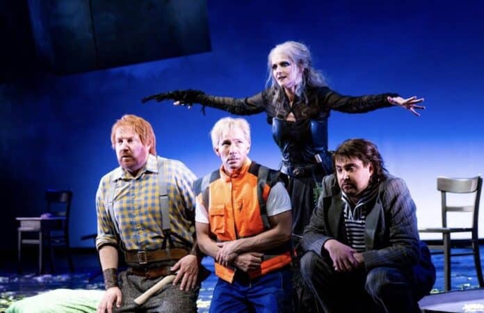 Spielstark sowie mit samtigem Timbre und erdigem Klang gibt Janja Vuletić die Hexe, fast ein wenig eine Erda aus dem „Ring“, numinos, rätsel- und orakelhaft, wie ja die Hellastädter ihre Prophezeiung tatsächlich nicht zu deuten wissen. Mit vogelartigen Bewegungen schwebt sie in ihrem pechschwarzen Kostüm mit bleichem Gesicht gleichsam über den anderen Figuren, gespenstisch und phantomartig, zugleich gebieterisch ihren Zauberstab wie das Szepter einer archaischen Muttergottheit schwingend.
