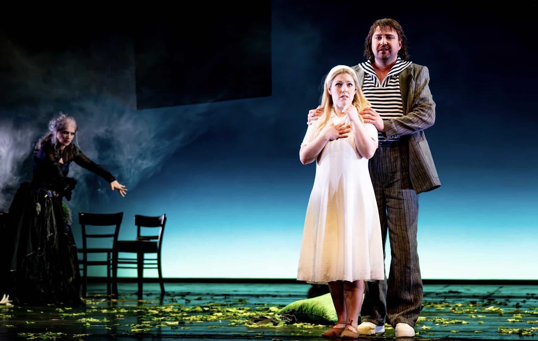 Im ersten Akt wird das Hexenhäuschen mit rauchendem Schornstein auf die Rückwand der Bühne projiziert, über die mystische Nebelschwaden geheimnisschwanger wabern. Im Vordergrund ein paar den Waldboden andeutende Blätter sowie ein grünes Kissen, rechts daneben ein kleiner Teich, aus dem Gänsemagd (Anna Schoeck) und Königssohn (Gustavo Eda) gemeinsam trinken und sich neckisch mit Wasser bespritzen, sowie ein Felsbrocken. Nach Bedarf können auf die Rückwand dräuende Baumstämme mit Flammenaugen à la „Herr der Ringe“ projiziert werden, etwa wenn die Gänsemagd den Wald entgegen dem sie bindenden Zauber der Hexe (Janja Vuletić) verlassen will. Eindringlich wird so die Abgeschiedenheit greifbar, in der die Gänsemagd aufwächst, in ihrer ganzen Ambivalenz von Behütet- und Eingesperrtsein durch die von ihr als Großmutter betrachtete Hexe, eine Ambivalenz, aus der erst die Begegnung mit dem Königssohn sie befreit.